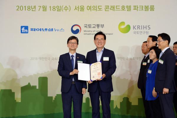 지난 18일 서울 여의도 콘래드 호텔에서 열린 ‘2018 대한민국 국토대전’에서 동대문구의 서울한방진흥센터가 대통령상을 수상했다. 사진은 유덕열 구청장(오른쪽)과 손병석 국토교통부 차관(왼쪽)이 기념 사진을 촬영하는 모습. (사진제공=동대문구청)
