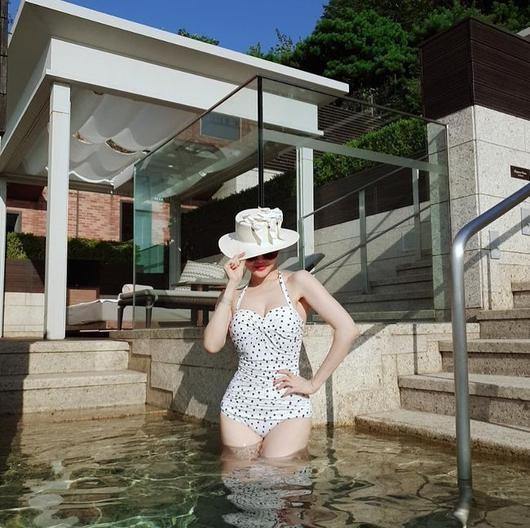 아이비는 21일 자신의 SNS에 "쉬는날마다 물놀이"라는 글과 함께 수영장에서 여름을 만끽하고 있는 모습을 공개했다. 공개된 사진 속에서 아이비는 물방울 무늬 수영복을 입고 볼륨있는 S라인을 드러낸 모습이다.