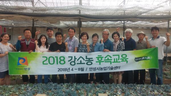 최근 경기 안성시농업기술센터는 지역농가와 전문가들이 품질향상과 경영개선방향을 모색해 가는 맞춤형 컨설팅 프로그램인 ‘2018년 강소농 후속교육’의 5회차 교육을 실시했다. 사진은 교육 종료 후 관계자들이 기념촬영을 하는 모습.(사진제공=안성시청)
