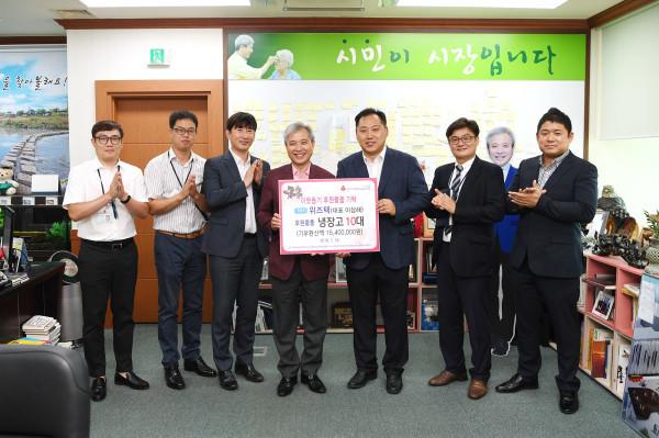 경기 오산시 외삼미동에 소재한 위즈텍은 지난 19일 지역내 소규모 취약 사회복지시설을 위한 이웃돕기 후원물품으로 냉장고 10대(1540만원 상당)를 기탁했다. 사진은 기탁식에 참석한 관계자들이 기념촬영을 하는 모습.(사진제공=오산시청)