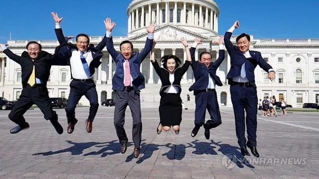미국을 방문 중인 여야 5당 원내대표들이 19일(현지시간) 워싱턴DC 연방의회 의사당 앞에서 밝은 표정으로 만세를 부르며 펄쩍 뛰어오르고 있다. 왼쪽부터 정의당 노회찬, 더불어민주당 홍영표, 자유한국당 김성태, 더불어민주당 박경미, 민주평화당 장병완, 바른미래당 김관영 의원.