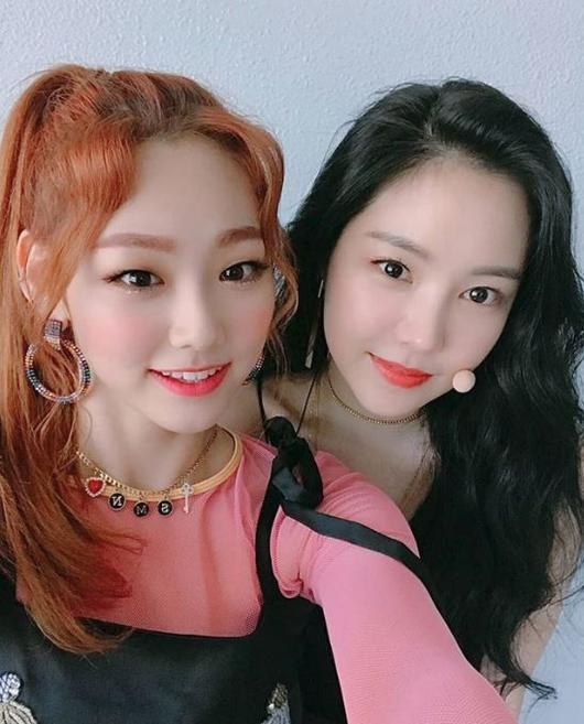 공개된 사진 속에는 한 음악방송 대기실에서 만난 미나와 나은이 얼굴을 맞대고 '셀카'를 찍고 있는 모습이 담겼다. 특히 성숙미를 콘셉트로 내세운 에이핑크와 상큼발랄한 여름을 콘셉트로 한 미나가 서로 미모를 폭발시키며 눈길을 끌고 있다.