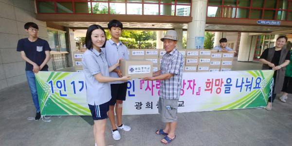 최근 성동구 응봉동은 최근 광희중학교 후원을 통해 학생들이 어려운 이웃을 위해 기부한 생필품으로 채워진 사랑의 상자 50개를 지역내 홀몸노인들에게 전달했다. 사진은 광희중학교 학생들이 사랑의 상자를 전달하고 있는 모습. (사진제공=성동구청)
