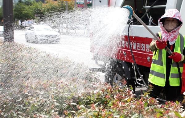 23일 오전 광주 동구 도로변 가로수에 동구청 직원이 물을 뿌려주고 있다.