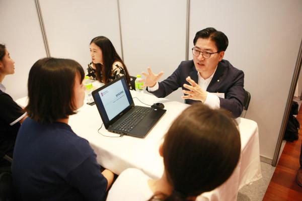 23일 강동아트센터에서 열린 ‘2019학년도 강동 원스톱 진로진학 박람회’에 이정훈 강동구청장이 대학시절 전공과목(정치외교학)을 살려 전공 선택에 어려움을 겪는 청소년들을 대상으로 일대일 전공 상담을 진행했다. 사진은 이 구청장이 청소년들과 상담을 진행하고 있는 모습. (사진제공=강동구청)