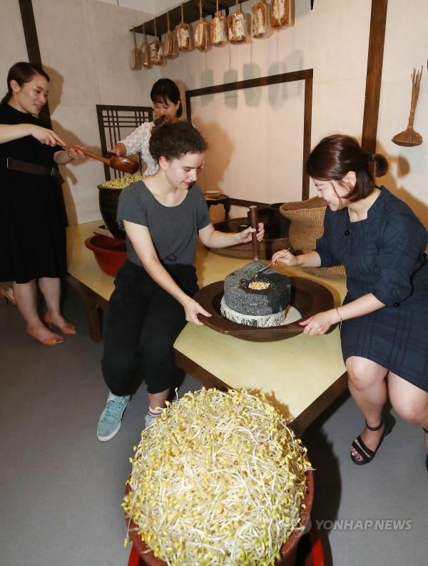 24일 오전 서울 중구 농업박물관에서 열린 '역사로 보는 우리 농산물 콩' 기획전에서 전시장을 찾은 프랑스 유학생과 직원들이 맷돌 갈기와 콩나물 시루에 물을 주는 체험을 하고 있다.