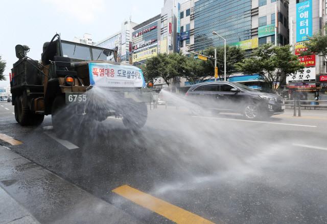 폭염이 이어진 24일 오후 육군 제50보병 사단 제독 차량이 대구시 북구 구암동 일대 도로에 물을 뿌리며 열을 식히고 있다.