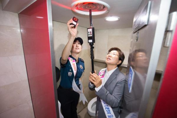 | ▲ 김미경 구청장(오른쪽)이 구파발역 화장실에서 불법촬영장비 점검을 하고 있다. (사진제공=은평구청) | ||