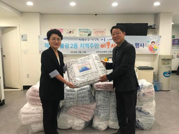 최근 서울 은평구 불광2동이 종로구 소재 ‘삼성의료재단 강북삼성병원’ 간호부로부터 지역내 홀몸노인들을 위한 여름이불 75채(200만원 상당)를 전달받았다. 사진은 관계자들이 이불을 전달받고 기념촬영을 하고 있는 모습. (사진제공=은평구청)