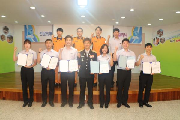 경기 군포소방서가 최근 1분기 하트세이버 유공자와 군포 철쭉축제 개최유공자, 2분기 우수소방관에 대해 표창장을 수여식을 개최했다. 사진은 수여식에서 표창장을 수여받은 수상자 11명이 모여 기념촬영을 하고 있는 모습. (사진제공=군포소방서)