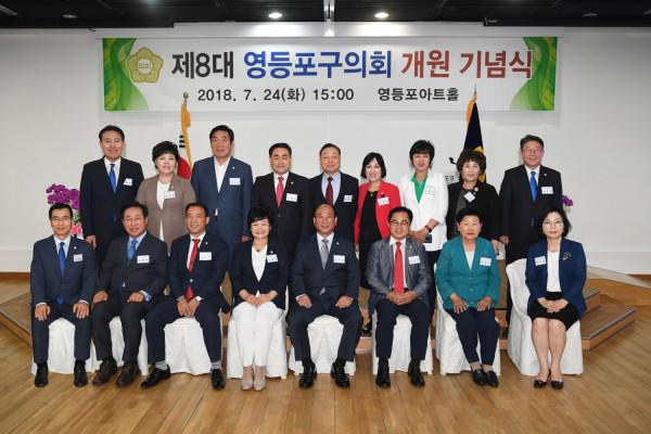 서울 영등포구의회는 지난 24일 오후 3시 영등포아트홀 전시실에서 윤준용 의장을 비롯한 현직 의원들과 채현일 구청장 및 정진원 의정회장 등이 참석한 가운데 ‘제8대 의회 개원기념식’을 개최했다. 사진은 개원기념식에 참석한 윤 의장 등 의원들이 기념촬영을 하는 모습. (사진제공=영등포구의회)