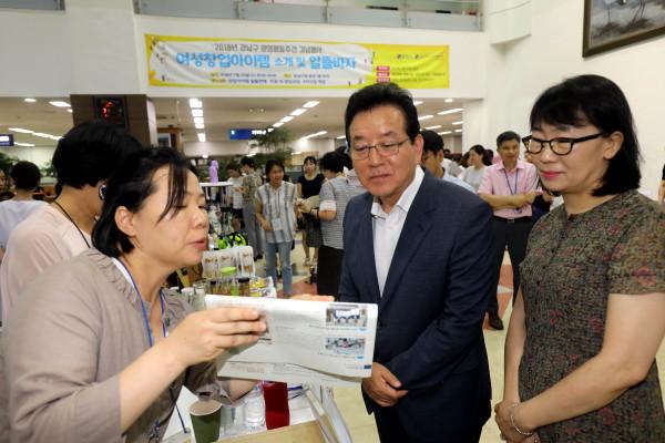 25일 강남구가 구청 1층 로비에서 ‘강남구 여성창업아이템 소개 및 알뜰바자회’를 개최했다. 사진은 행사에 참석한 정순균 구청장(가운데)이 부스를 둘러보며 창업아이템에 관한 소개를 듣고 있는 모습. (사진제공=강남구청)