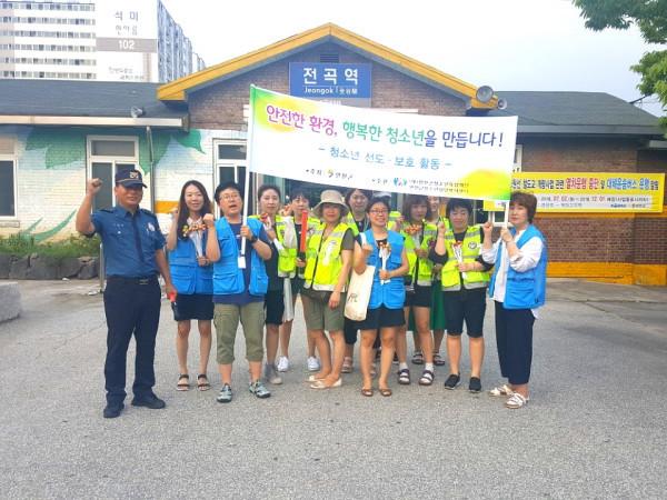 경기 연천경찰서가 여름방학을 맞이해 25일 학부모폴리스와 함께 하는 ‘청소년 선도 및 범죄예방 활동 거리 캠페인’을 진행했다. 사진은 경찰 및 학부모폴리스 관계자들이 전곡역 앞에서 캠페인을 진행하고 있는 모습. (사진제공=연천군청)