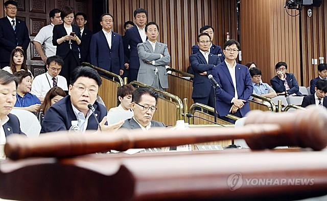 26일 국회에서 열린 인사청문특별위원회에서 퇴장한 틈에 회의를 강행한 것에 자유한국당 의원들이 항의하고 있다. 뒤쪽으로 더불어민주당 홍영표, 자유한국당 김성태, 바른미래당 김관영 원내대표 등 당 지도부가 회의를 지켜보고 있다.