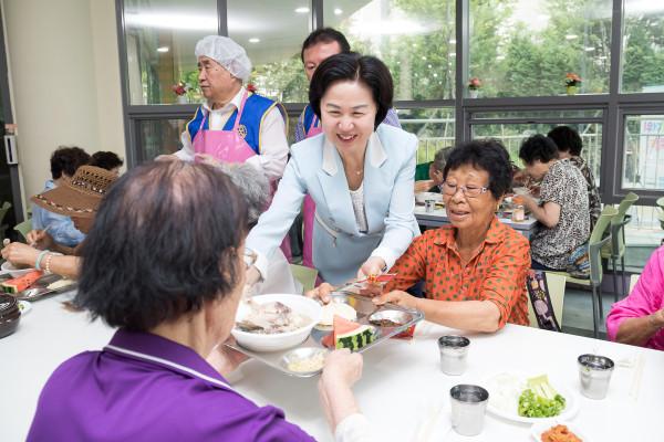 지난 25일 오전 11시20분 김수영 양천구청장이 신월종합사회복지관에서 열린 ‘삼계탕 나눔행사’에 참석해 노인들에게 삼계탕을 배식했다. 이날 행사에서 지속되는 폭염으로 지쳐 있는 노인들 350명에게 삼계탕을 대접하고, 건강한 여름나기를 위한 캠페인을 진행했다.(사진제공=양천구청)