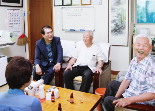 한상율 수원시 팔달구청장은 26일 지역내 무더위 쉼터(경로당) 및 주거취약계층인 옥탑방에 거주하고 있는 홀몸노인을 방문했다. 사진은 한 구청장(맨 왼쪽)이 노인들과 이야기를 나누는 모습.(사진제공=팔달구청)