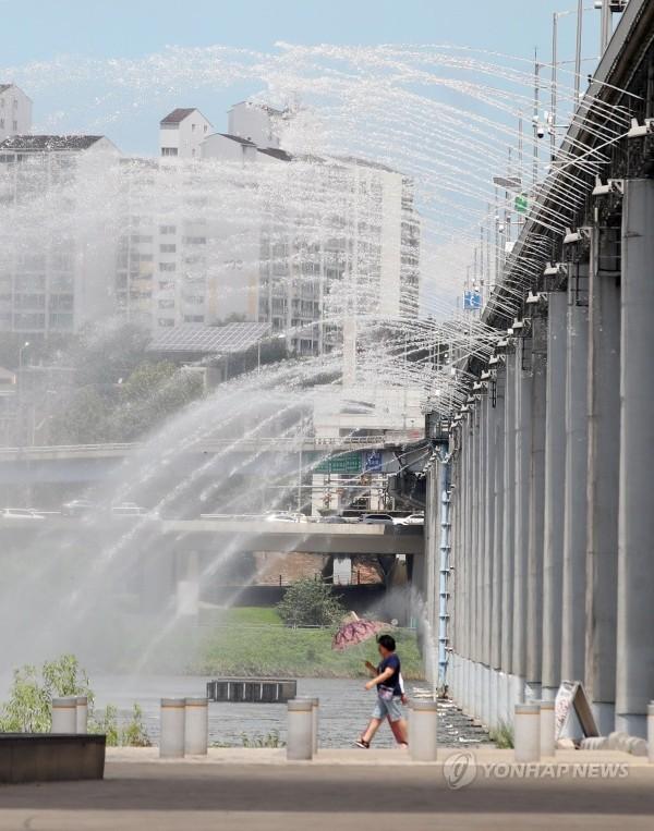 폭염이 계속되고 있는 30일 오후 서울 서초구 반포대교 달빛 무지개 분수에서 시원한 물줄기가 나오고 있다.