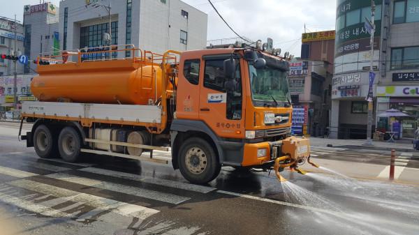 30일 군에 따르면 이번 살수작업은 기온이 최고조에 달하는 오후 1시~4시 유동인구가 많은 강화읍 주요 도로를 중심으로 살수차를 이용해 1일 3회 왕복 운행하고 있다.