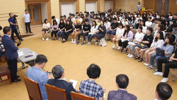 박승원 경기 광명시장은 최근 시청 대회의실에서 오는 8월17일까지 시청, 초등학교, 아동센터 등지에서 근무하는 여름방학 아르바이트 대학생 150명과 함께 허심탄회한 간담회를 실시한다. 사진은 앞서 진행된 간담회의 모습. (사진제공=광명시청)