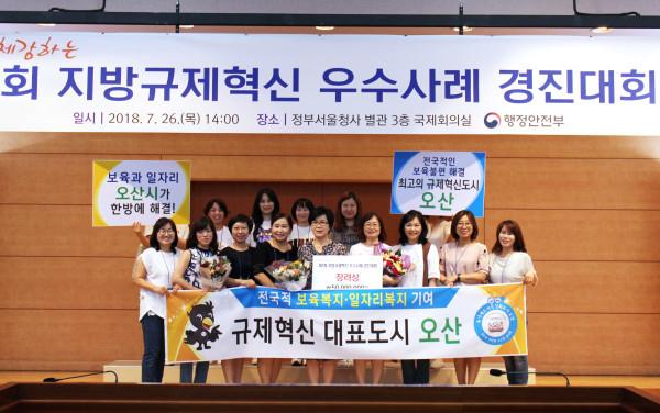 경기 오산시는 지난 26일 정부서울청사 별관 국제회의실에서 행정안전부 주최로 열린 ‘제1회 국민이 체감하는 지방규제혁신 우수사례 경진대회’에 참가해 장려상을 받았다. 사진은 장려상 수상 후 시 관계자들이 기념촬영을 하는 모습. (사진제공=오산시청)