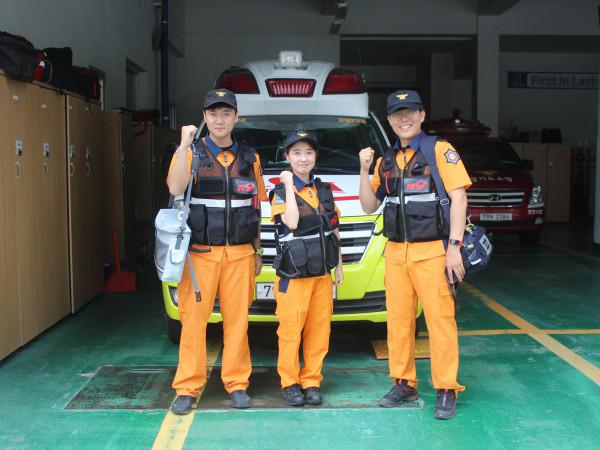 경기 포천소방서가 오는 9월 말까지 폭염 구급대를 운영하기로 결정하고, 구급대원 47명과 구급차 9대, 펌뷸런스 13대를 동원하기로 했다. 사진은 폭염 구급대에 참여하고 있는 소방관들이 기념촬영을 하는 모습. (사진제공=포천소방서)