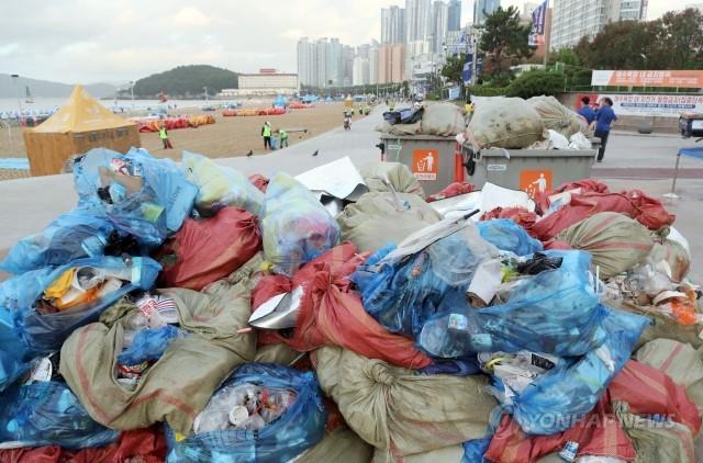 30일 부산 해운대해수욕장에서 수거한 각종 쓰레기가 쌓여 있다. 본격적인 휴가철을 맞아 일요일인 29일 해운대해수욕장에 50만명의 피서객이 찾았다. 피서객들이 백사장에 버리고 간 쓰레기를 30일 새벽 4시부터 환경미화원들이 수거해 재활용과 폐기용으로 분류한 것이다. 피서 성수기를 맞아 평소보다 2∼3배 많은 쓰레기가 발생하고 있다고 한다.