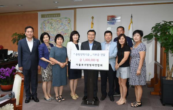 류경기 중랑구청장(왼쪽에서 다섯번째)이 30일 오후 3시30분 구청장실에서 ‘중랑자율부녀방범대연합회’로부터 ‘중랑장학기금’ 기부금 100만원을 전달받고 기념 촬영을 하고 있다. (사진제공=중랑구청)