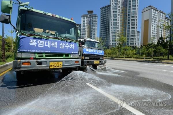 31일 광주 광산구 수완동 임방울대로에서 열린 '폭염대응 공사장 살수차 운행 발대식'에 동참한 지역 건설현장 살수차들이 폭염으로 달궈진 도로 위에 물을 뿌리고 있다.