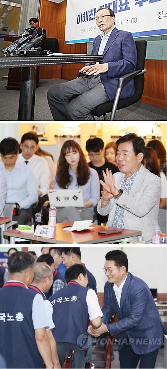 더불어민주당 차기 당권 주자로 나선 이해찬 의원이 31일 오전 전북 전주시 완산구 전북도의회에서 기자회견을 열고 취재진 질문에 답변하고 있다(위부터). 김진표 의원은 이날 서울 SK오픈콜라보 센터를 방문, 경제정책 간담회에서 발언하고 있다. 송영길 의원도 이날 서울시청 노동조합 회의실을 방문, 지부장 정기회의에서 참석자들과 인사하고 있다.