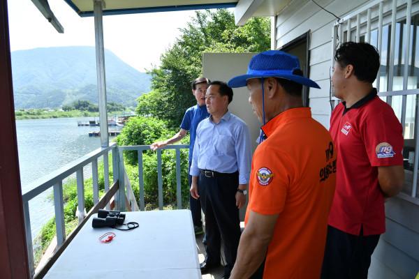 정동균 경기 양평군수는 지난 29일 지역내 물놀이관리지역 중 119시민수상구조대에서 운영하고 있는 물놀이 취약지역 7곳에 대한 현장점검을 실시했다. 사진은 현장점검에 참여한 정 군수(왼쪽에서 두 번째)가 현장을 둘러보고 있는 모습. (사진제공=양평군청)