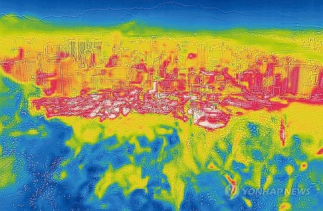 1907년 기상관측 이래 역대 최고 기온을 기록한 1일 오후 서울 남산에서 열화상 카메라로 촬영한 도심 일대가 붉게 표시되고 있다. 온도가 높을수록 붉게 낮을수록 푸르게 표시된다.