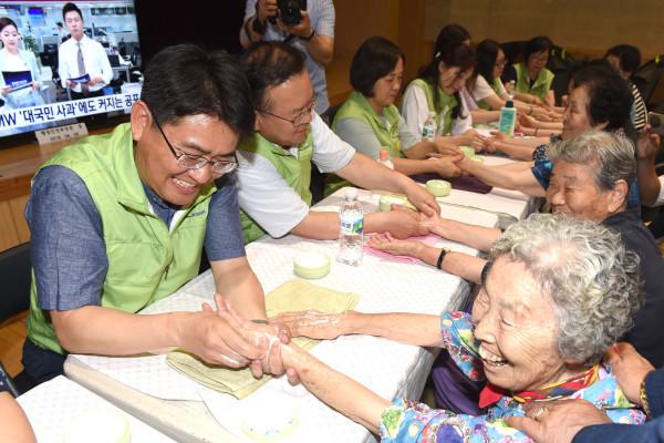 연일 폭염이 지속되고 있는 가운데 6일 김부겸 행정안전부 장관이 지역노인을 보호하기 위해 운영하고 있는 야간무더위쉼터를 벤치마킹하고자 노원구를 방문했다. 사진은 오승록 구청장(왼쪽)과 김 장관(왼쪽에서 두번째)이 무더위쉼터를 방문한 노인들을 대상으로 손마사지를 하고 있는 모습. (사진제공=노원구청)