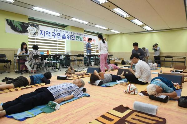 가천대학교 한의대 한방 의료봉사단인 ‘언재호야(焉哉乎也)’는 2003년부터 시작해 올해로 17년째 매년 여름·겨울방학 기간에 중랑구내 취약계층에게 사랑의 한방진료를 제공하고 있다. 사진은 지난 3일 노인들이 진료를 받고 있는 모습. (사진제공=중랑구청)