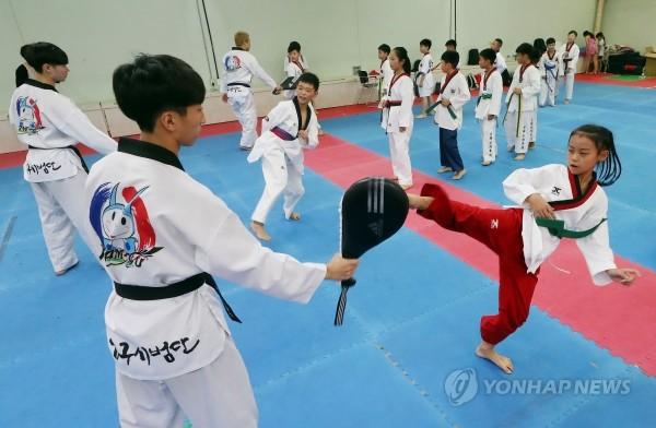 7일 오전 인천시 남구 인천대학교 도화캠퍼스 평생교육관에서 열린 '한중 학생 태권도 교류대회'에서 중국 학생들이 태권도 발차기를 배우고 있다.