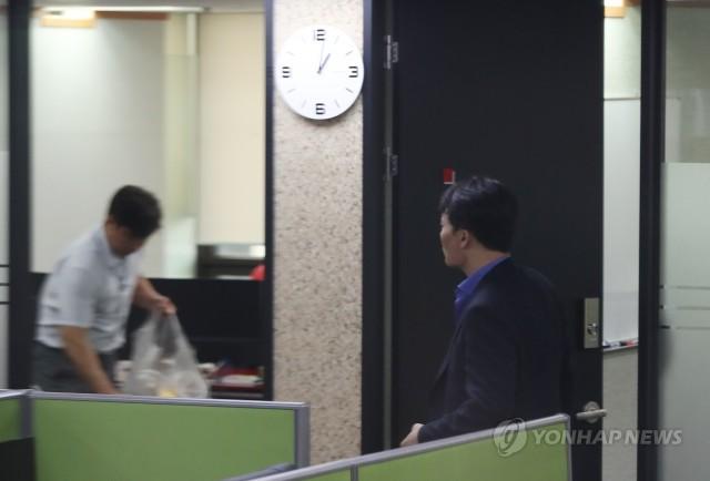 침몰한 보물선으로 알려진 러시아 순양함 '돈스코이'호와 관련한 신일그룹의 투자 사기 의혹을 수사하는 경찰이 이 회사 사무실 등을 압수수색하며 본격적으로 강제 수사에 나섰다. 사진은 이날 서울 여의도 신일해양기술 사무실에서 압수수색을 지켜보는 최용석 대표(오른쪽).