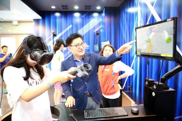 7일 이정훈 서울 강동구청장은 자기주도학습지원센터에서 초·중·고교 학생 및 학부모 250여명과 함께 하는 ‘여름방학 창의키움 캠프’에 참석했다. 사진은 가상현실(VR) 안전체험관에서 체험 중인 학생이 보고 있는 모니터를 구경하고 있는 이 구청장(가운데)의 모습. (사진제공=강동구청)