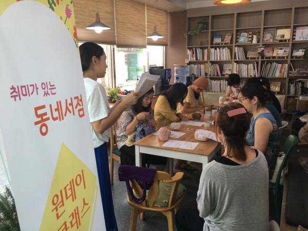인천 연수구립공공도서관은 최근 여름방학과 휴가철을 맞아 세종문고에서 지역서점과 연계한 특별행사 ‘취미가 있는 동네서점 원데이 클래스’를 진행했다. 사진은 행사에 참여한 주민들이 코바늘 뜨기를 배우고 있는 모습. (사진제공=연수구청)