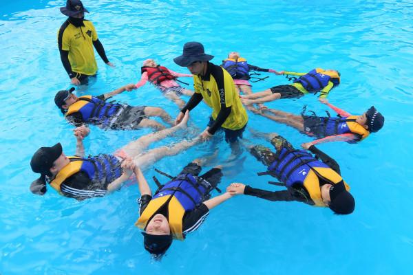7일 경기 평택시 안중출장소가 서부지역아동센터를 이용하는 아동 80여명의 초·중학생 대상으로 '생존수영 교육'을 실시했다. 사진은 교사의 지시에 따라 생존수영을 실시하고 있는 모습. (사진제공=평택시청)