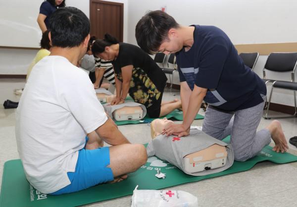 7일 서울시내 초·중·고 교원 20여명이 대한적십자사 서울시지사에서 심폐소생술 교육을 받았다. 이날 교육은 대한적십자사 응급처치법 전문 강사의 지도로 진행됐다. 사진은 참여자들이 심폐소생술 실습을 하고 있는 모습. (사진제공=대한적십자사 서울시지사)