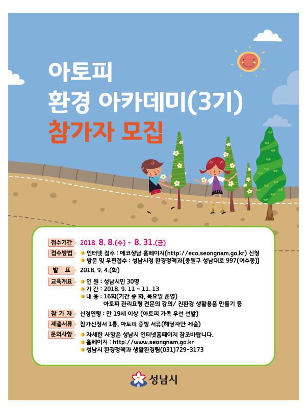 [성남=오왕석 기자] 경기 성남시가 오는 31일까지 ‘아토피 환경 아카데미’에 무료로 참여할 시민 30명을 모집한다.