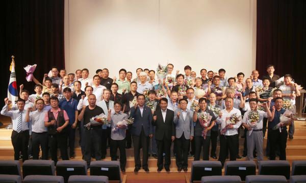 | ▲ 백군기 시장이 개인택시 신규면허자 59명과 기념사진을 찍고 있다. (사진제공=용인시청) | ||