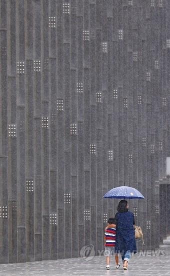 한때 소나기가 내린 9일 서울 서대문구 이화여대에서 한 모자가 우산을 쓰고 캠퍼스를 지나고 있다.