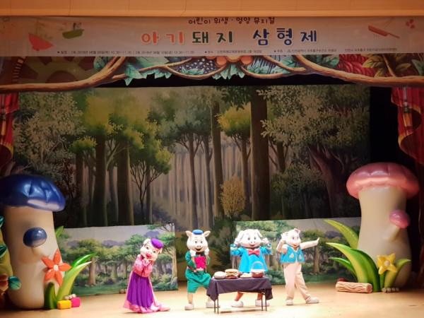 인천 미추홀구 어린이급식관리지원센터는 9~10일 센터 등록 어린이들의 위생·영양수준 향상을 위한 뮤지컬 ‘아기돼지 삼형제’ 공연을 진행했다. 사진은 배우들이 열연을 펼치는 모습.(사진제공=연수구청)