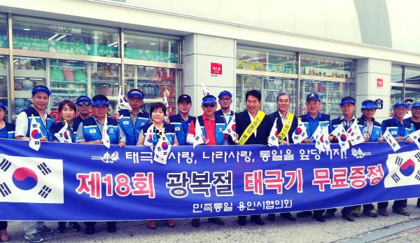 민족통일 용인시협의회는 지난 10일 ‘제73주년 광복절’을 앞두고 시민들에게 애국심을 고취하고, 통일운동 참여를 유도한다는 취지에서 ‘태극기 나눔 행사’를 개최했다. 사진은 백군기 시장과 협의회 관계자들이 행사에 참석해 기념촬영을 하는 모습. (사진제공=용인시청)