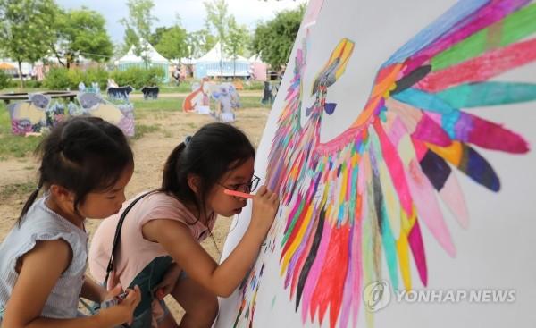 '2018 한강몽땅 여름축제'의 하나로 지난 12일 오후 서울 여의도 한강공원에서 열린 '예술동물원 한강 ZOO'에 참석한 어린이들이 동물 그림을 색칠하며 멸종위기종에 대해 알아보고 있다.