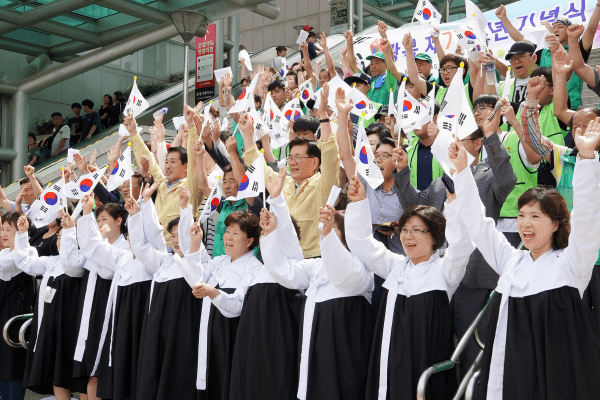 서울 동대문구 청량리역 광장에서 열린 ‘광복 제73주년 기념식’에 유덕열 구청장이 참석해 광복 73주년을 기념하고 순국선열들의 고귀한 희생과 애국정신을 기렸다. 사진은 새마을운동 동대문구지회 회원을 비롯한 참석자들과 태극기를 흔들며 ‘대한독립만세’를 외치고 있는 유 구청장의 모습.(사진제공=동대문구청)