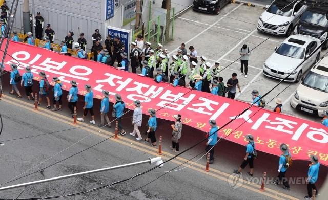 광복절인 15일 부산 동구 초량동 일본영사관 앞에서 민주노총 조합원과 부산지역 시민사회단체 회원 등 500여명이 집회를 마친 뒤 '일본은 전쟁범죄 사죄하라'는 대형 플래카드를 들고 영사관 주변을 행진하고 있다.