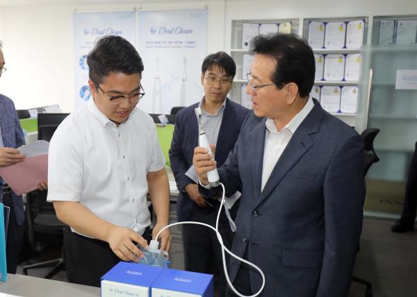 정순균 강남구청장은 최근 역삼동에 위치한 대한민국 대표 기술창업 인큐베이터 팁스타운(Tech Incubator Program for Startup Town)을 방문, 현장을 시찰하고 입주기업을 격려했다. 사진은 정 구청장(오른쪽)이 팁스 프로그램 참여 기업의 제품에 대해 설명을 듣고 질문을 하고 있는 모습. (사진제공=강남구청)