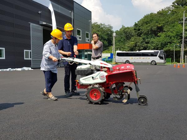 경기 안성시 농업기술센터는 지난 13일 시 녹색농업대학 귀농귀촌학과 학생들을 대상으로 현장교육을 실시했다. 사진은 ‘여성친화 농기계 실습’에 참석한 교육생이 교육 관계자의 도움을 받아 농기계를 사용법을 배우는 모습. (사진제공=안성시청)