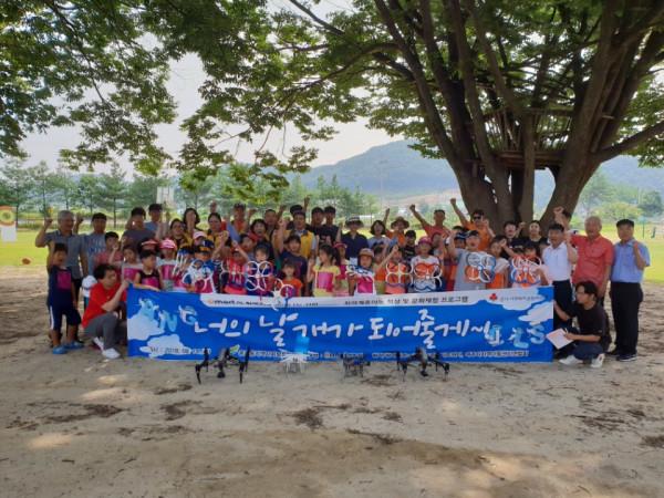 최근 경기 여주시 중앙동과 중앙동 지역사회보장협의체는 점동면 소재 늘푸른 자연학교에서 취약계층 아동들을 대상으로 ‘창의&문화놀이 체험캠프’를 실시했다. 사진은 캠프에 참여한 아동들이 드론을 배경으로 기념촬영을 하는 모습. (사진제공=여주시청)